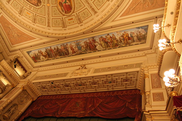 wir den 1,8 Tonnen schweren Kronleuchter, die Bühne und Ränge.